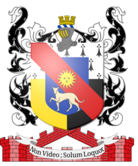 | Gallery | an inescutcheon azure on a bend gules a sun in glory or over a dog passant guardant bisque. Achievement: A peer's helmet a torse argent and azure its crest a mural crown or. Mantling: counter ermine and argent. Motto: "Non Video ; Solum Loquor". Compartment: a castle gules |