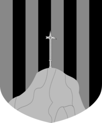 Coat of Arms paly gray and black, in fess point, a warhammer silver, a mountain iron